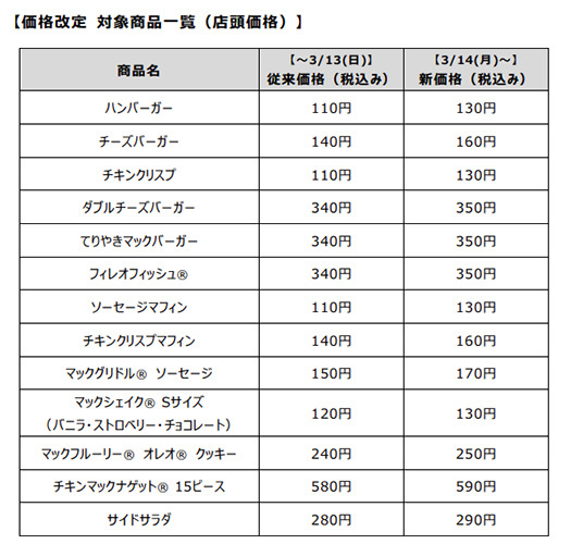 値上げ開始は3月14日から で2割の商品が 10円20円値上げ されるようです. 今回マックの値上げは 約6割の品目の店頭価格 税込みが10円30円値上げ されるそうです.